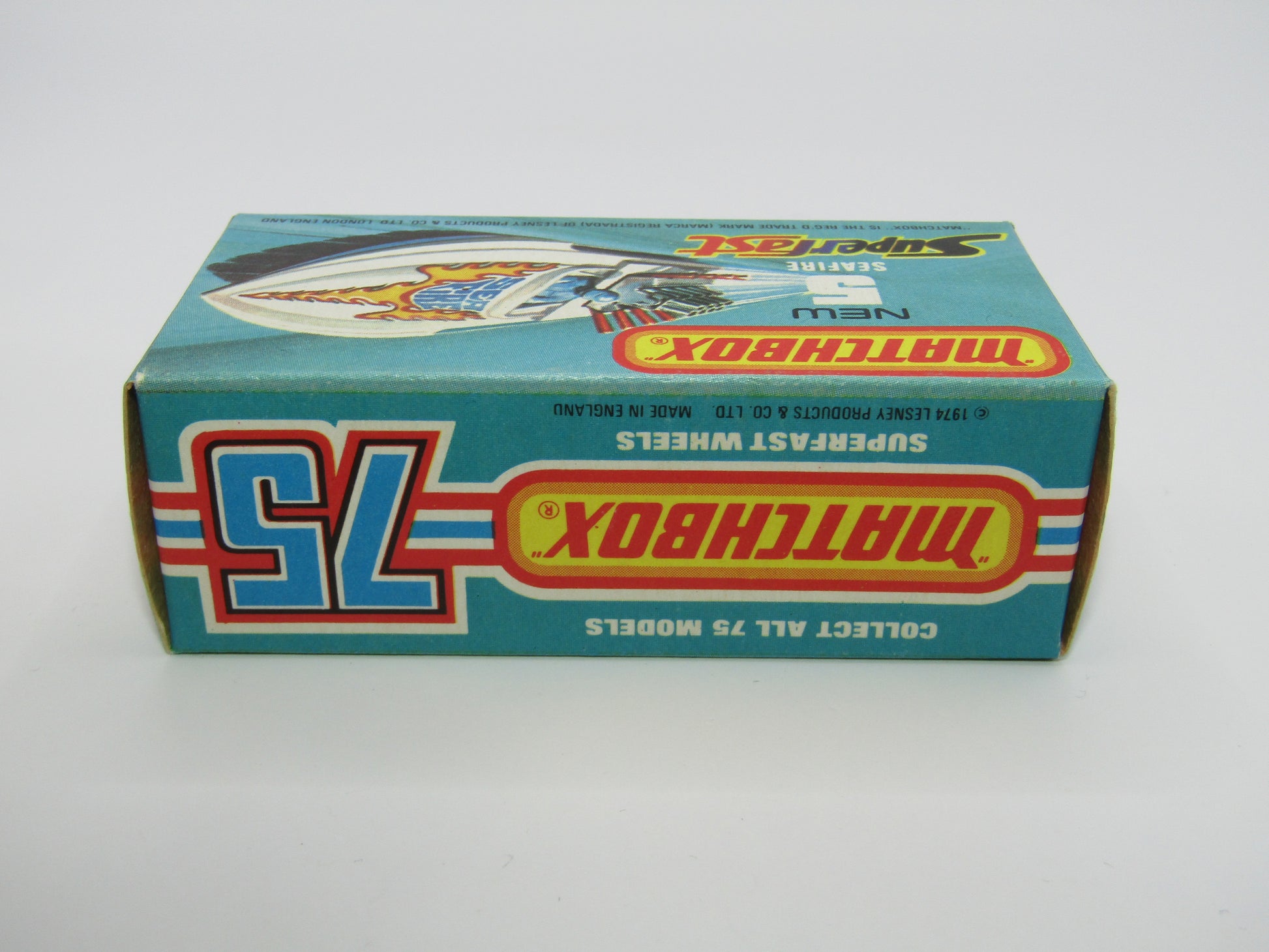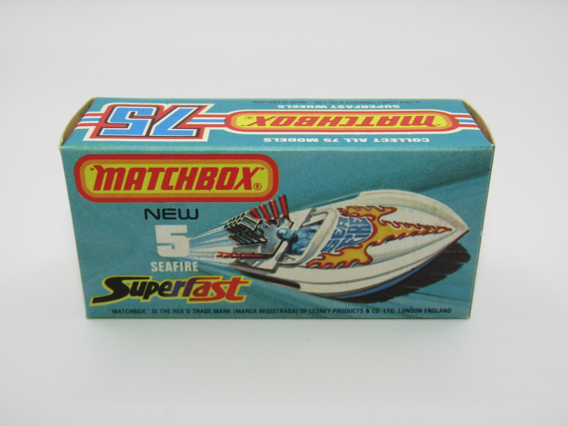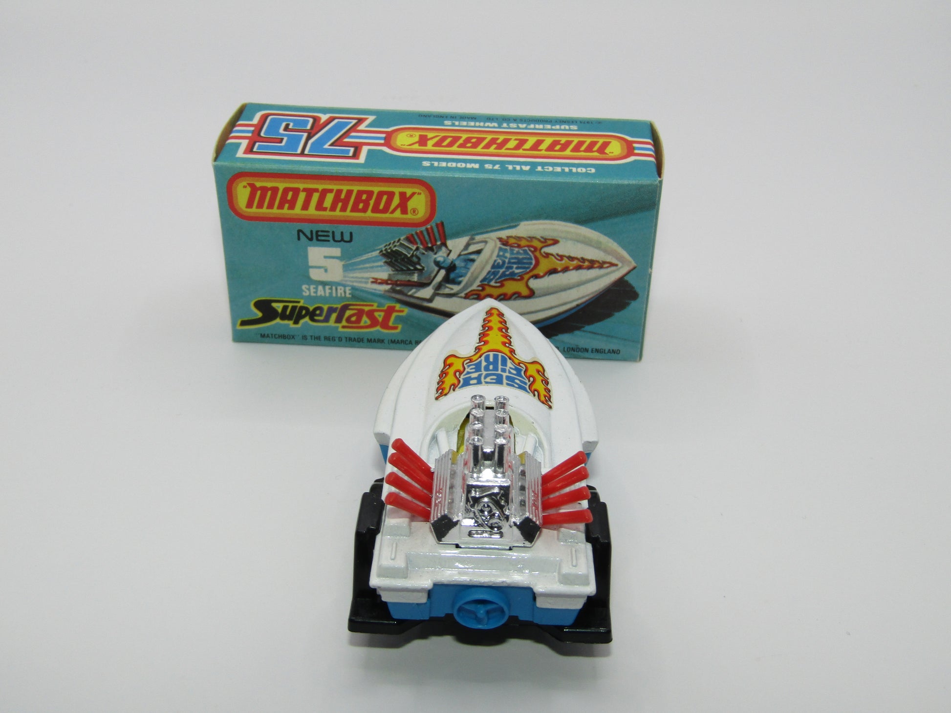 Matchbox Superfast 5B Seafire Boat, White, LEMON Driver, Blue Base, Red Engine Pipes