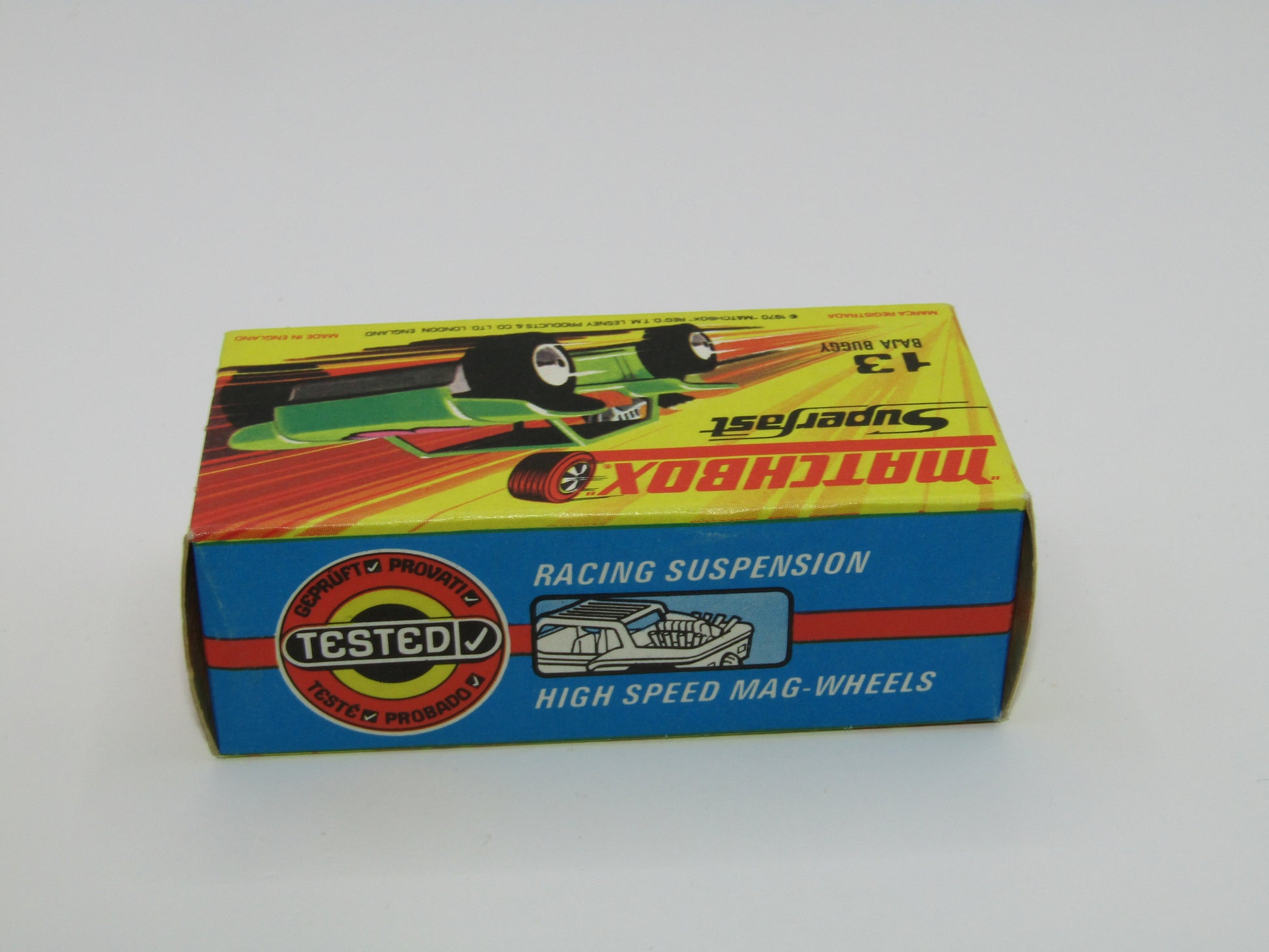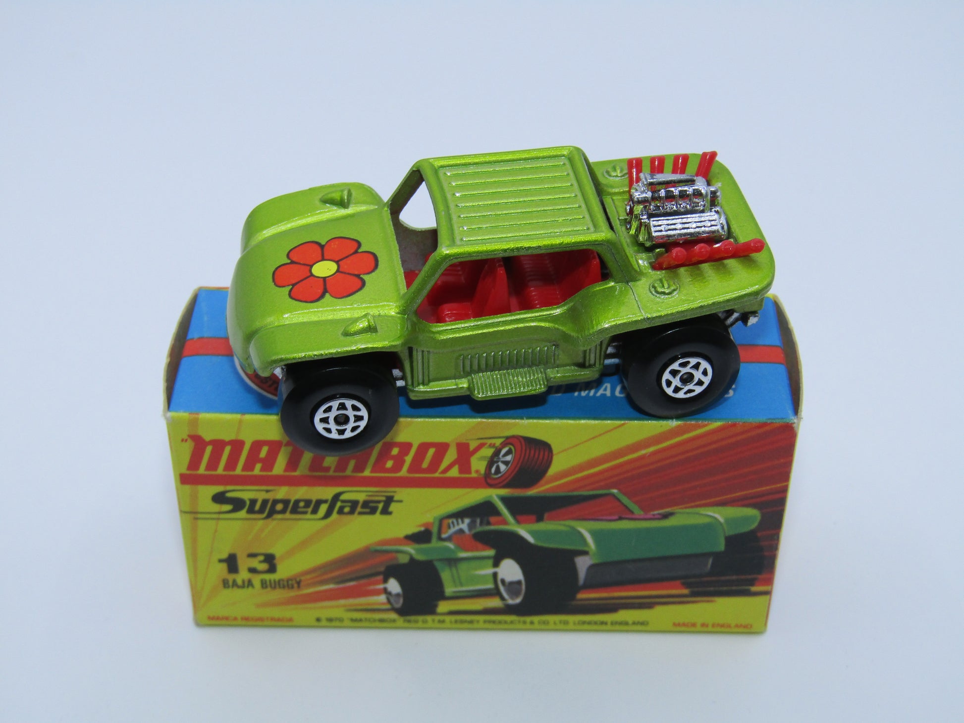 Matchbox Superfast No 13B Baja Buggy Light Metallic Green, Red Interior, Red Engine Pipes