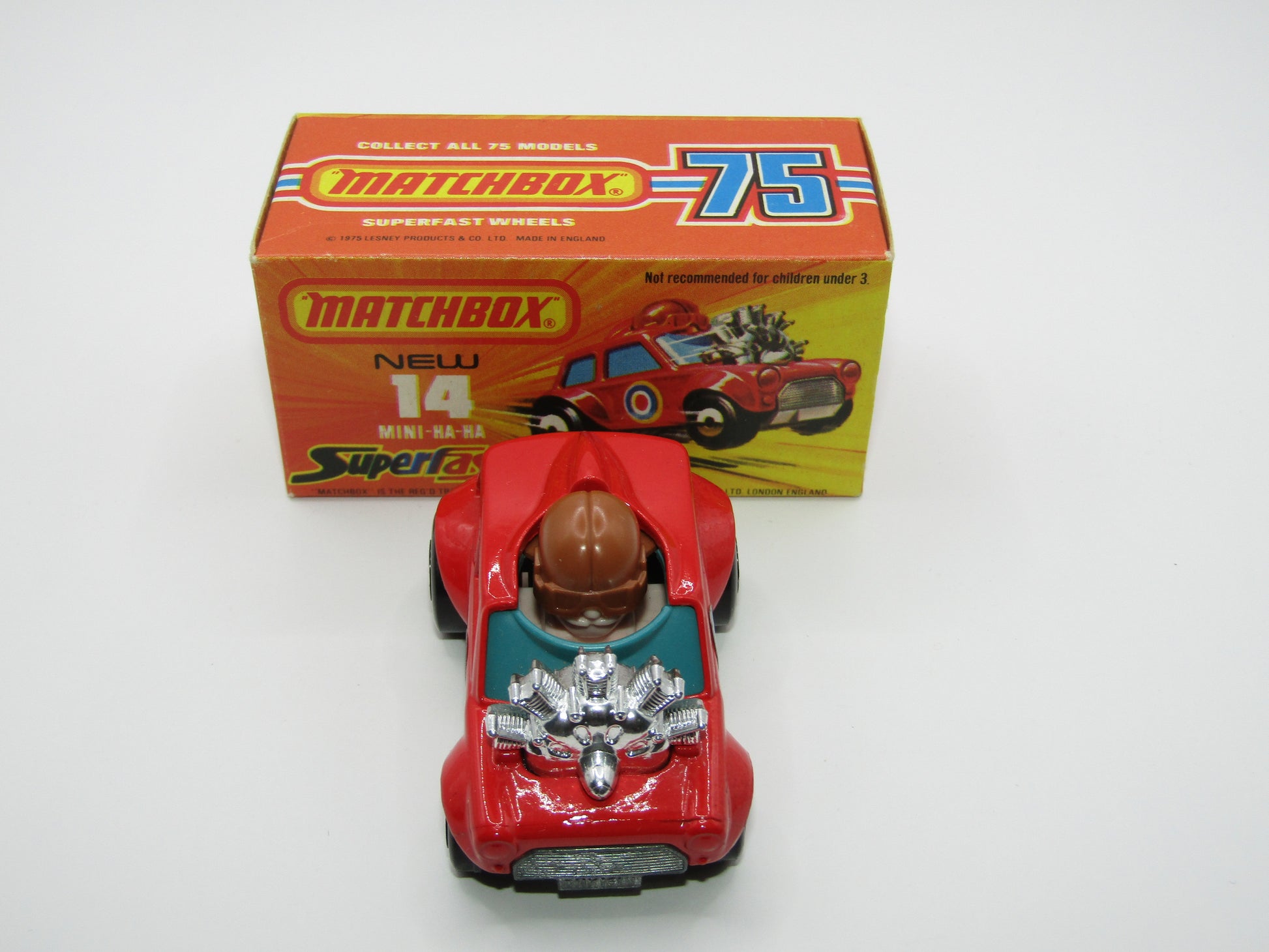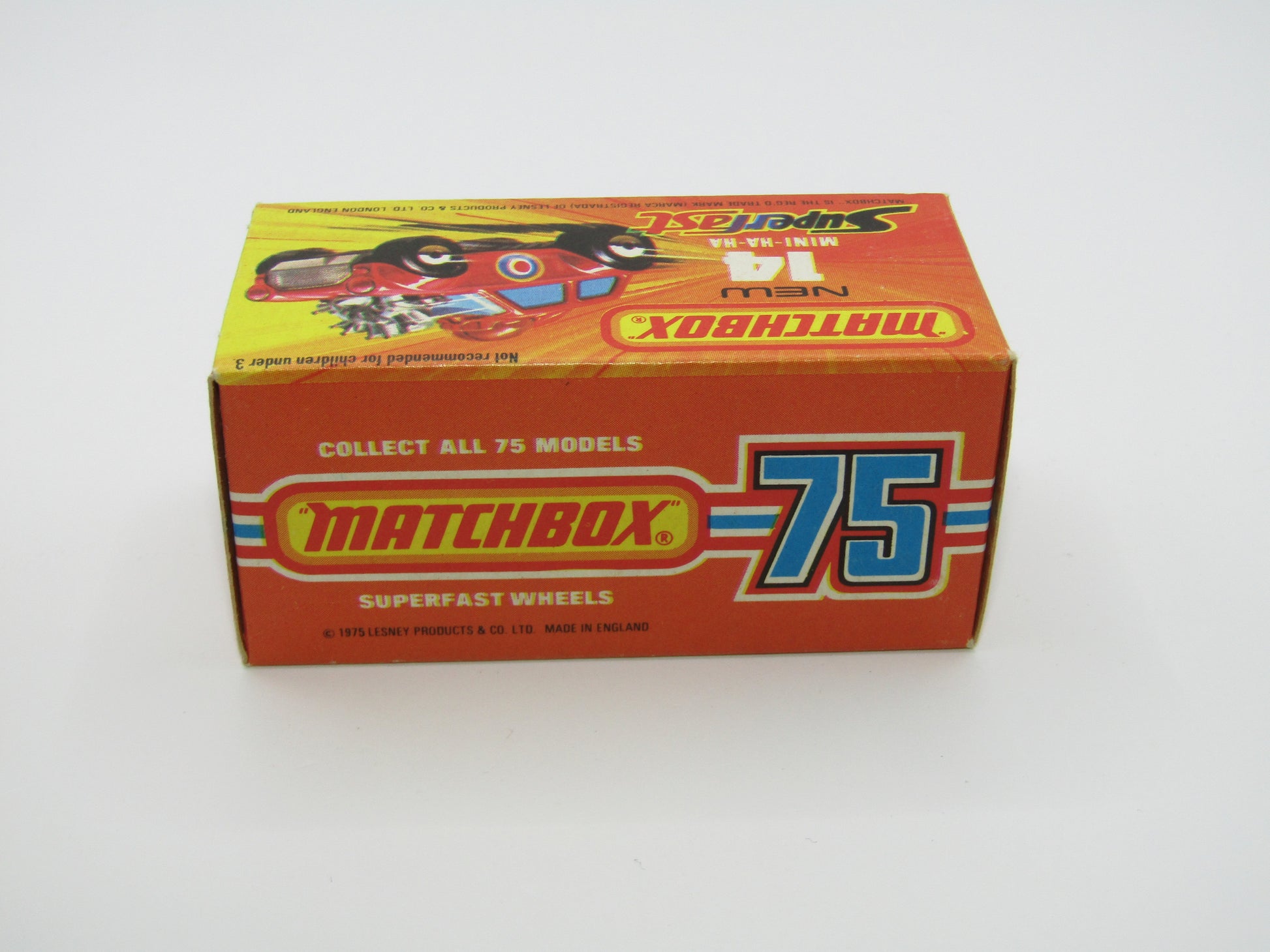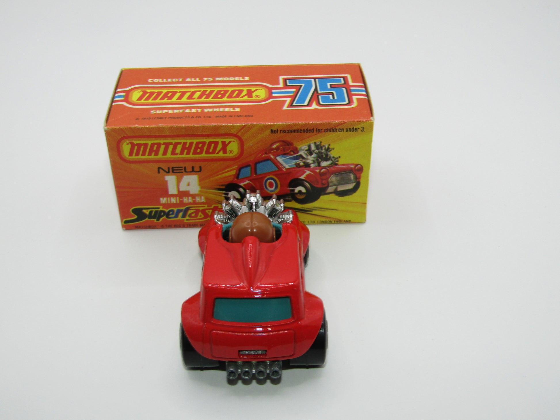 Matchbox Superfast No 14B Mini Ha-Ha LIGHT PINK Driver, Light Brown Helmet, 2 Colour Labels , GREEN Windows, Not Recommeded Box