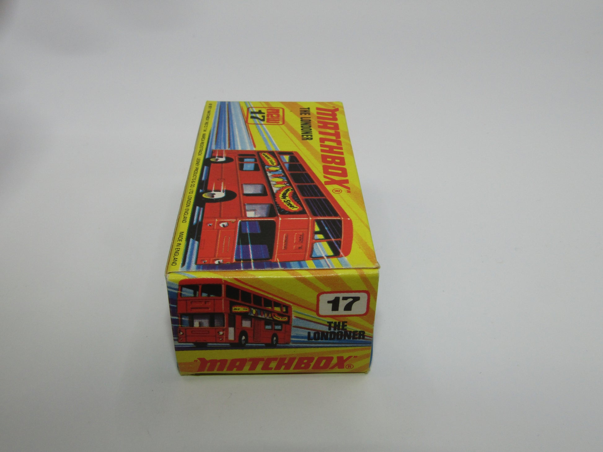Matchbox Superfast No 17B The Londoner, RED Silver Jubilee, LIGHT YELLOW Interior, Dot Dash Wheels, BLACK PLASTIC BASE
